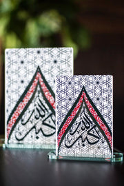 Double sided Metal Mini with acrylic stand. Verses 40-41 of Surah Ibrahim, 'Rabbey Ja-alni Muqeema as Salaati....'recitation of which is said to be effective in keeping oneself and one's offspring regular in prayer.